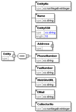 | source | <xs:element name="Entity"> <xs:complexType> <xs:sequence> <xs:element name="EntityNo" type="xs:nonNegativeInteger"/> <xs:element name="Name" type="xs:string"/> <xs:element name="EntitySSN"> <xs:simpleType> <xs:restriction base="xs:string"> <xs:length value="10"/> </xs:restriction> </xs:simpleType> </xs:element> <xs:element name="Address"> <xs:complexType> <xs:sequence> <xs:element name="Line1" type="xs:string"/> <xs:element name="Line2" type="xs:string"/> <xs:element name="PostalCode" type="xs:nonNegativeInteger"/> <xs:element name="City" type="xs:string"/> </xs:sequence> </xs:complexType> </xs:element> <xs:element name="PhoneNumber" type="xs:string"/> <xs:element name="FaxNumber" type="xs:string"/> <xs:element name="WebSiteURL" type="xs:string"/> <xs:element name="EMail" type="xs:string"/> <xs:element name="CollectorNo" type="xs:nonNegativeInteger"/> </xs:sequence> </xs:complexType> </xs:element> |