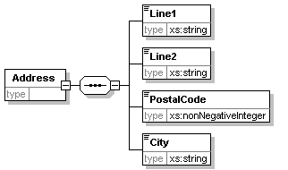 | source | <xs:element name="Address"> <xs:complexType> <xs:sequence> <xs:element name="Line1" type="xs:string"/> <xs:element name="Line2" type="xs:string"/> <xs:element name="PostalCode" type="xs:nonNegativeInteger"/> <xs:element name="City" type="xs:string"/> </xs:sequence> </xs:complexType> </xs:element> |